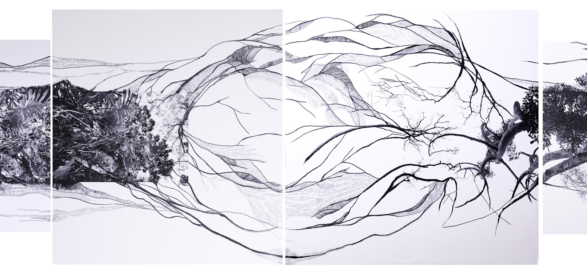 For Raices (Roots), the artist used drawing as a medium that gave her the freedom to escape the rigid rectangle of a photograph and embrace installation as a threshold to an experience that engrosses the viewer and that suggests the notion of infinity that she addresses in her work. Thus, trapped in the midst of nature, the individual merges with it and leaves aside any personal attributes. Tabora’s work also underlines environmental concerns such as the effect we humans have had in depleting, destroying and polluting large portions of our planet. Yet her work also reflects upon possible bridges, latitudes and connections, by using geographically diverse species of trees and plants in poetic correspondence, as a way to speak universally about the magnificence and preponderance of nature above all that is human. Tabora’s medium and large scale manipulated photo-collages, as well as her straight black and white photographs, trace a path back to a moment when humankind and the natural world were implicitly united. Her work thus offers a reflection about how mapping nature can be a metaphor for discovering ourselves, in an infinite and poetic way. For Raíces, her first solo exhibition in Budapest, Tabora’s main intention is to create a natural map of the senses, a re-reading of human ontological issues, of the traces in which we meld with our natural space, and the life within.